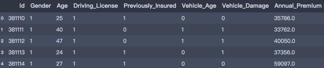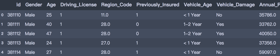 数据划分为训练集和测试集,训练数据包含381109笔客户资料,每笔客户资料包含12个字段,1个客户ID字段、10个输入字段及1个目标字段-Response是否响应(1代表感兴趣,0代表不感兴趣)。测试数据包含127037笔客户资料;字段个数与训练数据相同,目标字段没有值。字段的定义可参考下文。