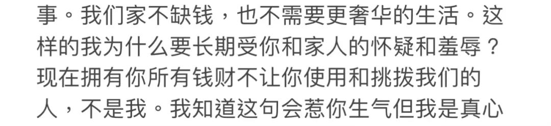更可悲的是,她们这样自以为的不贪财,付出忍耐,在富人眼里也一文不值,特别是在要分手、面对利益纷争的时候。就连有超强赚钱能力的大明星嫁入豪门都要被豪门规矩束缚,更何况普通老百姓呢?