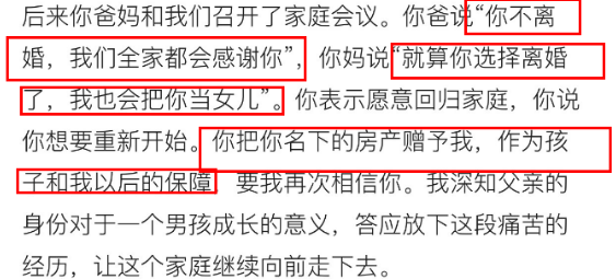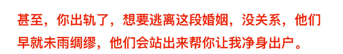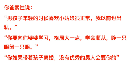 但到了婚姻实在走不下去的时候,媳妇立马会变成他们口中的外人,利益也会让他们扭成一股绳,原来承诺的感谢,当女儿都是变成了浮云……
