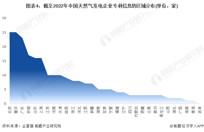 从专利区域分布来看,目前中国天然气发电有相关专利信息的企业主要分布在北京和重庆等地。截至目前,北京市与重庆市各有25家企业拥有专利相关信息。