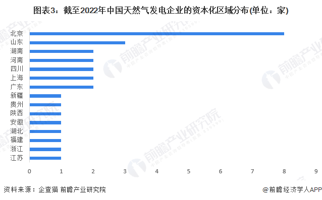 根据中国企业数据库企查猫,目前中国天然气发电资本化的企业(有融资信息和上市信息)的主要分布在北京、山东等地。截至目前,北京共有存续和在业的资本化企业共计8家,山东有3家。