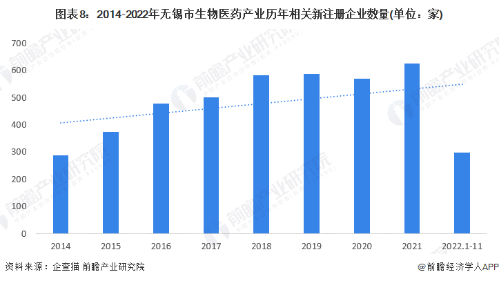 根据企查猫查询数据显示,近年来生物医药历年新注册企业数量也快速增长。截至2022年11月29日,无锡生物医药产业相关的注册企业超4400家,其中2021年新注册企业数量创历史高峰,达625家;2022年1-11月,无锡生物医药产业注册企业数量为298家,但仍然处于高位,表明无锡生物医药产业的发展热潮未减。