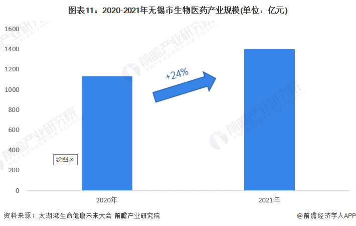 生物医药是“十四五”无锡构建“465”现代产业体系中的重要一环。在生物医药产业规模方面,2021年无锡生物医药产业规模超1400亿元,同比增长24%,入选中国生物医药产业发展指数地级市20强