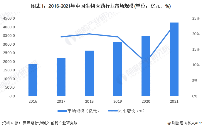 2021年,国家发展改革委出台了《“十四五”生物经济发展规划》,将生物医药产业位列四大重点发展领域之首。据弗若斯特沙利文报告数据显示,从2016年到2020年,中国生物医药行业市场规模从1836亿元增长到3457亿元,复合年增长率达到17.14%。根据弗若斯特沙利文的测算,2021年,中国生物医药行业市场规模约为4248亿元。