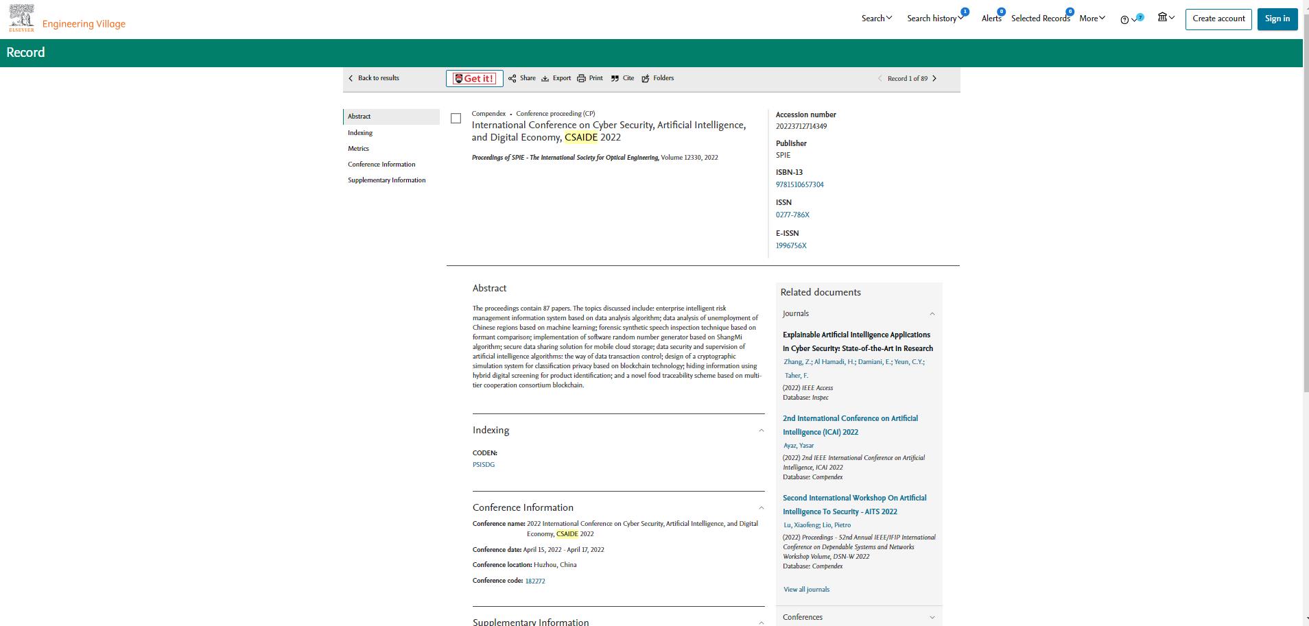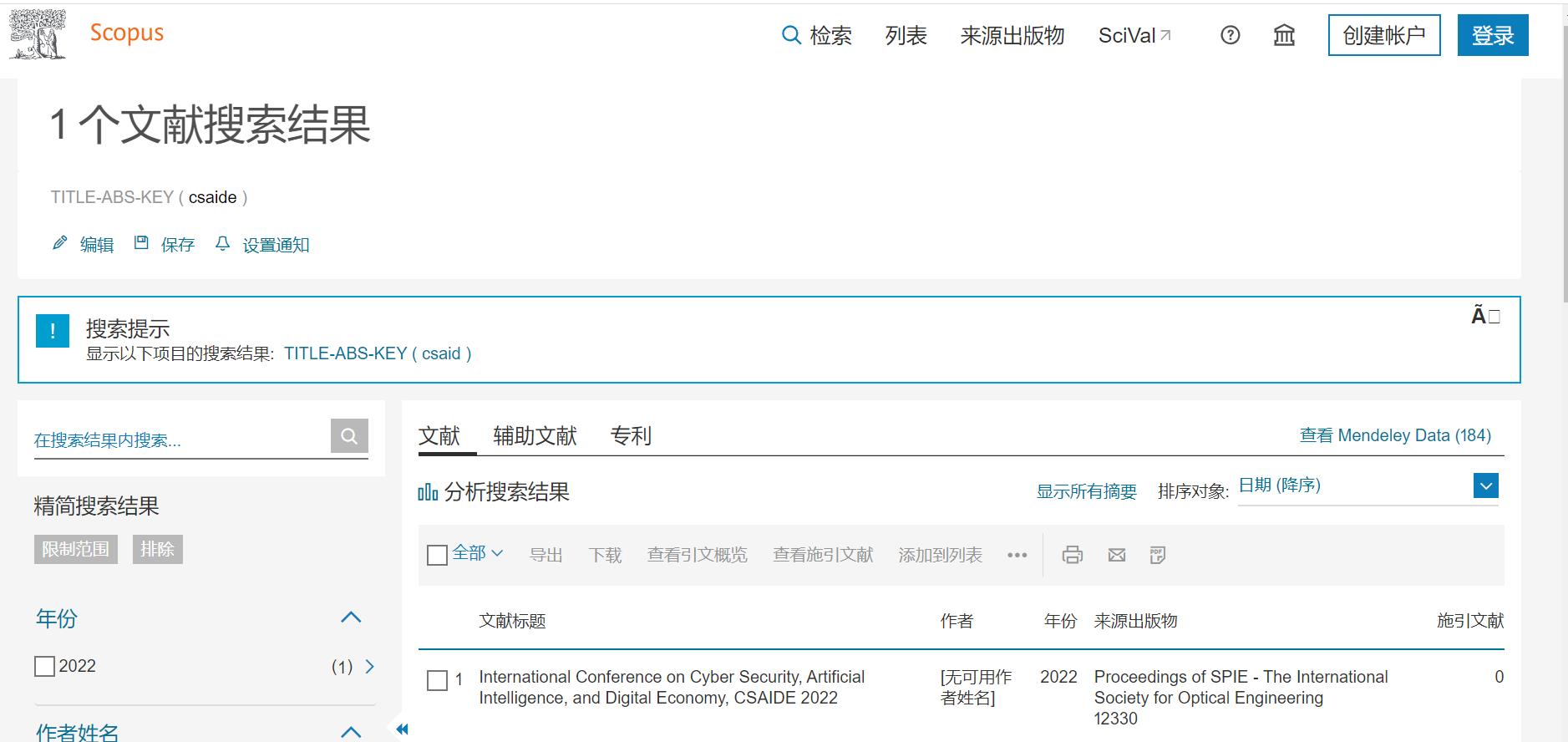 、检索。SPIE of CSAIDE 2022 | EI index of CSAIDE 2022 | Scopus index of CSAIDE 2022 |
