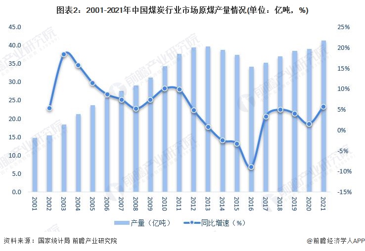 依据国家统计局数据,2001-2020年,我国原煤的产量整体呈上升趋势。2016年我国原煤产量下降至近十年最低点,为34.1亿吨,主要由于煤炭行业进行结构转型升级。2021年,全国原煤产量41.3亿吨,比2020年增长5.7%,创下历史新高。