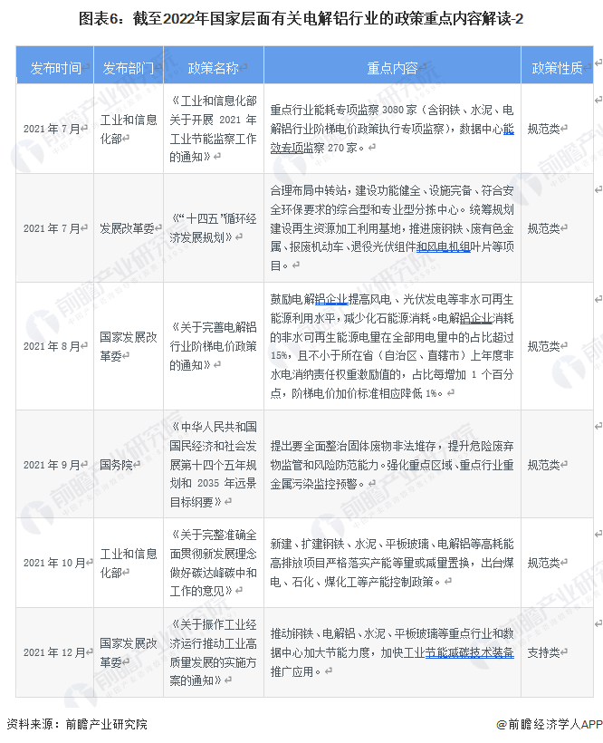 为了达到铝行业2030年碳达峰,国家需要巩固化解电解铝过剩产能成果,严格执行产能置换,严控新增产能。推进清洁能源替代,提高水电、风电、太阳能发电等应用比重。通过制定行业能效标杆水平和基准水平,分类推动项目提效达标,限期分批改造升级和淘汰落后产能以及阶梯电价方式,倒逼行业进行节能降碳技术改造,加快淘汰落后产能。国家层面有关电解铝行业的政策如下所示: