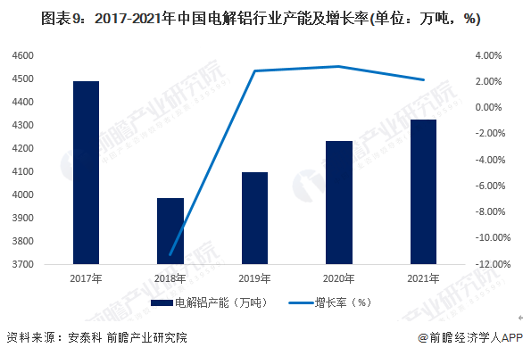 由于中国2018-2019年供给侧去产能,导致2018年中国电解铝产能大幅下降,产能由4490万吨下降至3986.3万吨,下降了11.22%。2021年,电解铝行业产能实现恢复性增长,产能为4325万吨,同比增长2.2%。