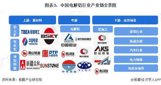 电解铝产业链包括上游原材料,中游电解铝,下游铝加工、终端应用等,上游原材料包括铝土矿、氧化铝、预焙阳极等,下游应用场景包括建筑行业、轨道交通、汽车行业、电力领域与包装市场等。