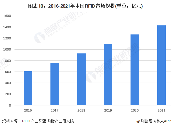 射频识别(RFID)产业是国家优先发展的产业之一。2012年开始,我国工信部、农业部、商务部、财政部等部门都出台政策推动和规范超高频RFID行业的发展。2016年以来,中国RFID市场规模持续增长,2019年突破1000亿元,2021年达到1431亿元,较2020年增长了13.12%。