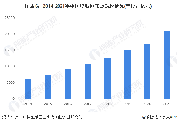 近几年来,在各地政府的大力推广扶持下,物联网产业逐步壮大。再加之近几年厂商对物联网这一概念的普及,民众对物联网的认知程度不断提高,使得我国物联网市场规模整体呈快速上升的趋势。2014-2021年,我国物联网市场规模整体呈稳步上升的趋势,中国通信工业协会的数据表明,随着物联网信息处理和应用服务等产业的发展,中国物联网行业规模已经从2014年的5960亿元增长至2020年的1.7万亿元。根据IoT Analytics的披露,2021年全球物联网市场规模增速为22%,据此初步统计2021年中国物联网市场规模超过2万亿元。