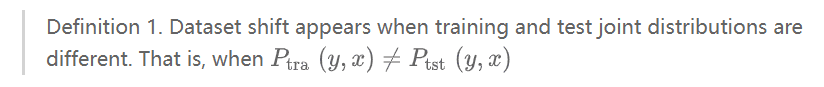 从贝叶斯定理可得P(y,x) = P(y|x) * P(x) = P(x|y) * P(y),当输入空间的边缘概率分布P(x) , 输出空间的标签分布P(y) 以及表示该机器学习任务的条件概率分布 P(y|x) 之中,有任一项因素发生偏移导致训练数据与预测数据 P(y,x)造成差异,即为数据集偏移现象。