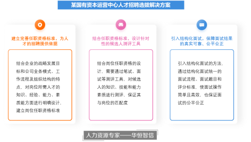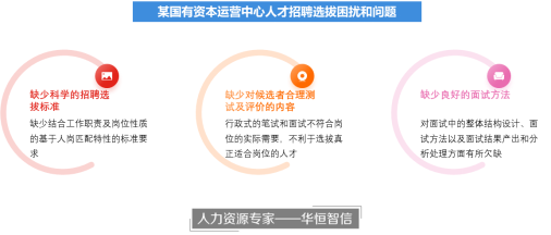 在国有资本运营中心成立后,为了保证各项业务能够迅速的开展落地,公司相关领导决定对公司的关键岗位引进社会高端人才,支持投融资等关键工作的顺利开展。由于公司刚刚组建不久,在人力资源管理领域的力量不足,且涉及到关键岗位的人才选拔,为了确保能够更好的招聘选拔出企业需要的人才,也为了保证过程公平公正,公司领导决定与专业的第三方进行合作,共同开展人才招聘与选拔工作。经过多轮的竞标,常年从事人力资源工作的华恒智信脱颖而出,双方达成合作意向。