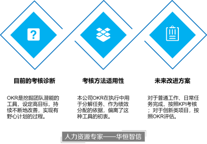 事实上,OKR是一种挖掘团队潜能的工具,是通过高目标的设定,持续不断的交流与改善,实现有野心计划的过程。华恒智信经过调研发现,该公司作为互联网类、技术类行业,与传统的有标准的生产类行业不同,很多工作采取的是团队合作的方式完成,且不易量化,从这个角度来看,采取OKR的考核方式有利于挖掘人才潜力、促进团队整体成果的完成。因此从大方向上,采用这种考核方法是没有问题的。