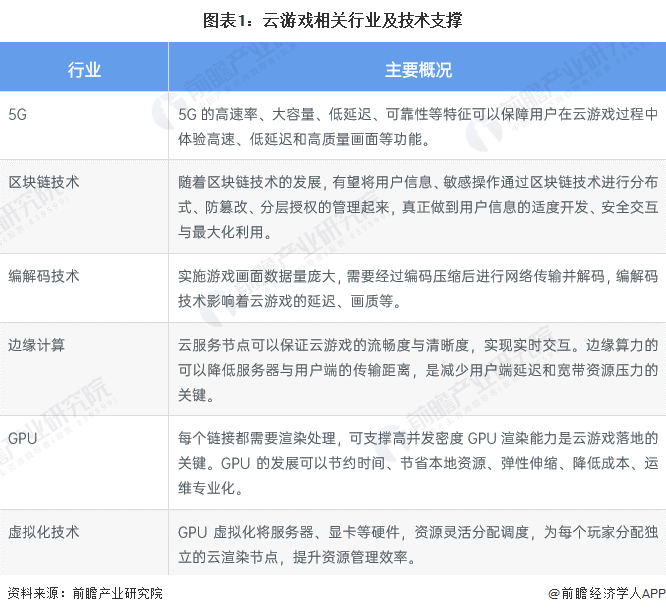 云游戏需要众多新兴技术的参与,主要为电信运营商、云服务商、硬件厂商等在不断创新及应用如5G、边缘计算、区块链等相关技术,为云游戏的落地及商业化提供了可能性: