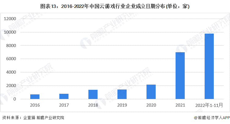 根据企查猫提供的数据来看,目前我国云游戏行业相关企业已经超过2.6万家,行业体量规模正在不断增大,从企业成立日期方面来看,2022年我国云游戏行业内企业新成立公司达到近年来的新高,截止2022年11月中国云游戏行业2022全年成立企业超过9700家。