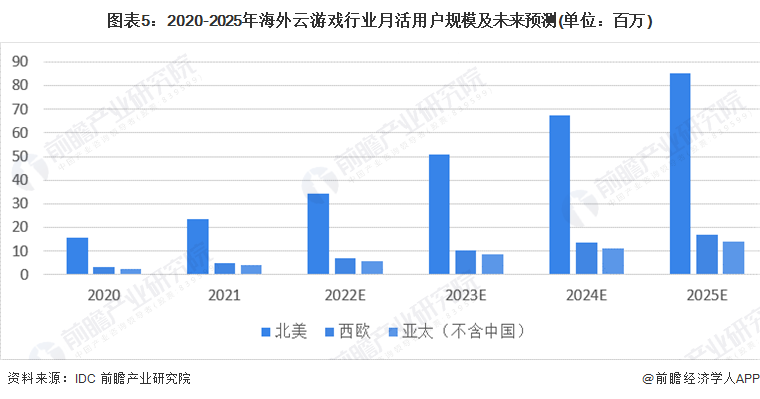 从海外市场云游戏平均月活人数来看,2021年海外云游戏月活人数(不包含中国)超过3000万人,其中北美拥有最多的云游戏用户,2021年平均月活人数达到2340万,西欧、亚太(不包含中国)的体量相较于北美来看明显减少。