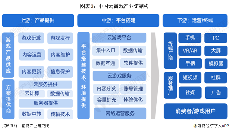 我国云游戏产业链上游主要由游戏研发产业、服务器设备以及云服务提供业务组成,中游由云游戏平台的运营、数据搭建以及云游戏服务、网络运营服务组成。