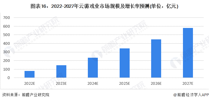 前瞻产业研究院预计,从整个云游戏行业的发展趋势来看,未来5年仍将保持较高的增速,2022-2027年复合增长率保持在30%左右。预计2022年全年,云游戏行业市场规模将接近80亿元,到2027年云游戏行业市场规模有望超过570亿元。