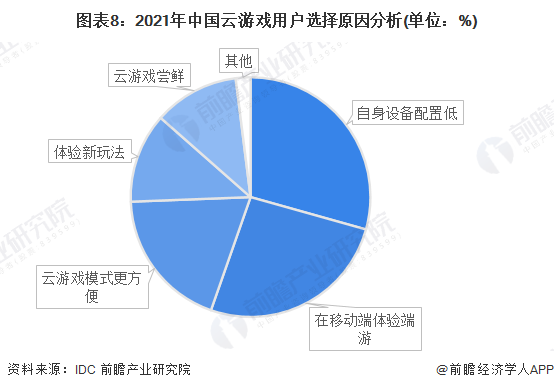 从中国云游戏对云游戏的选择原因来看,设备配置低、想体验高画质游戏是最大的需求点,其次为移动端模式体验,除此之外对于云游戏这类新型游戏模式的兴趣点也是目前用户主要的选择原因之一。