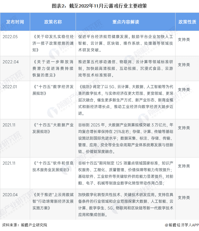 近年来,我国经济快速发展,大大推动云游戏周边市场发展。云游戏平台的搭建依赖于云计算、大数据、5G等新一代信息技术及软件领域的发展,国家近两年在此类产业的发展上也针对性的推出了各类支持性政策: