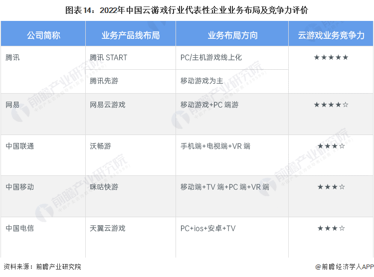 从企业竞争力的角度来看,前瞻结合中国云游戏行业主要企业的云游戏业务营收规模和企业主要聚焦业务类型,并通过对比企业技术规模发展现状,总结出目前中国云游戏行业企业竞争格局,综合来看腾讯和网易在云游戏业务中具备一定的竞争优势: