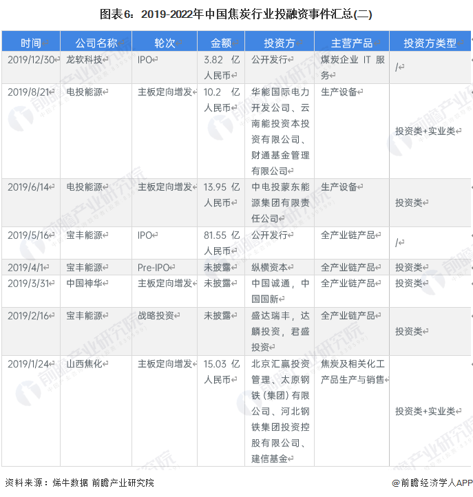 2019年-2022年我国焦炭行业的主要投融资事件如下: