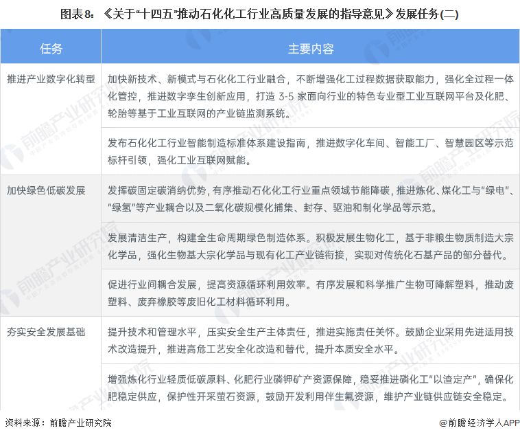 从对行业影响的角度来看,政策的发布可以帮助石油化工产业提升发展水平,促进产业结构的进一步调整,优化产业布局和加快数字化转型等;针对这些方面《意见》也做了针对性的任务规划: