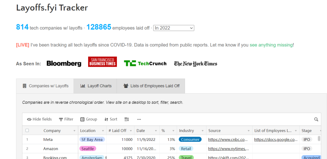 去年还处于辉煌巅峰的美国科技企业在这个年底,随着各个科技大厂裁员潮的蔓延,整个行业逐渐陷入恐慌之中。根据layoff tracker的数据显示:仅在美国,2022年从年初到年底,就有814家科技公司,共计接近13万名员工被裁员,或者即将失去工作。
