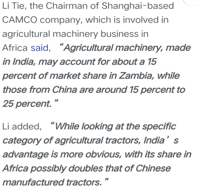 事后,德元公司在接受媒体采访时不得不承认,与印度拖拉机相比,中国拖拉机没有太大优势,印度拖拉机在非洲占领的市场份额,可能是中国的2倍以上。