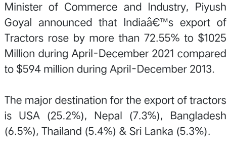 毕竟,印度工商部长皮尤什·戈亚尔曾表示,2021年4月至12月期间,印度出口的拖拉机中,有25.2%的份额涌入了美国。