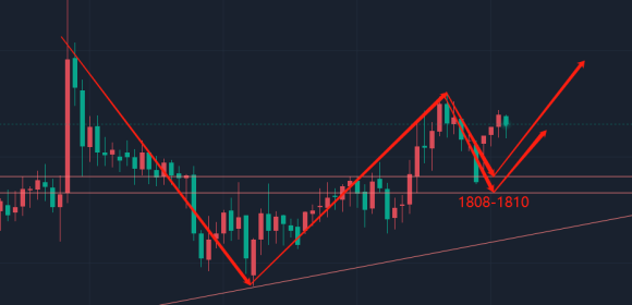 从日线进行观察,日K就是很明显的上升通道形态,价格的低点和高点在不断地拉高,昨天价格拉高回踩也是吞并了前一日K线,但价格在收盘阶段也是收取了上影单阳形态,那么今天短线还是需要向下走一波回踩,从均线上看,5日和10日跟兄弟一样同步延续上扬,早间短线回踩,目前价格也是运行在5日均线1809上方的位置,从布林带上看,布林带上轨和中轨都是呈现上扬形态,布林带下轨有向下拐头迹象,目前价格依托布林带中轨1796延续反弹,现在价格运行在布林带上轨1826下方的位置,价格整体偏向强势,从技术指标上看,MACD整体趋势是向下的,但价格运行在零轴上方的位置,从KDJ上看价格三线粘合向上发散,所以从日线上看大趋势还是有回踩需求,短线级别还是看向多头;