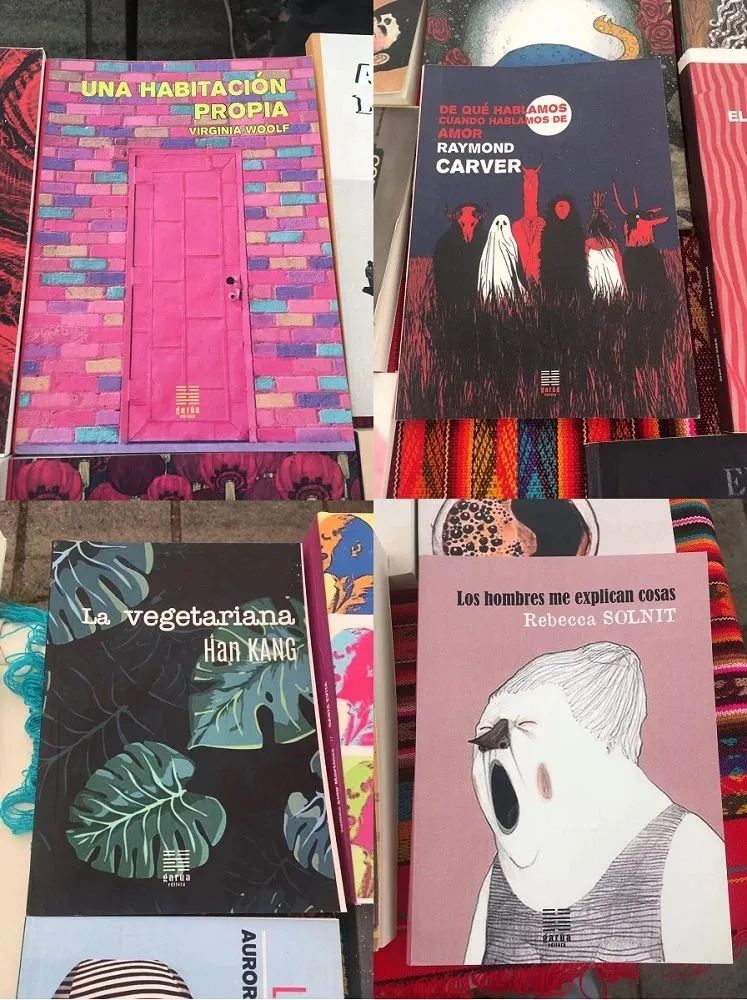 Garúa印制的部分盗版书,左上至右下分别是:《一间自己的房间》弗吉尼亚·伍尔夫;《当我们谈论爱情时我们在谈论什么》是雷蒙德·卡佛;《素食者》韩江;《爱说教的男人》丽贝卡·索尔尼特