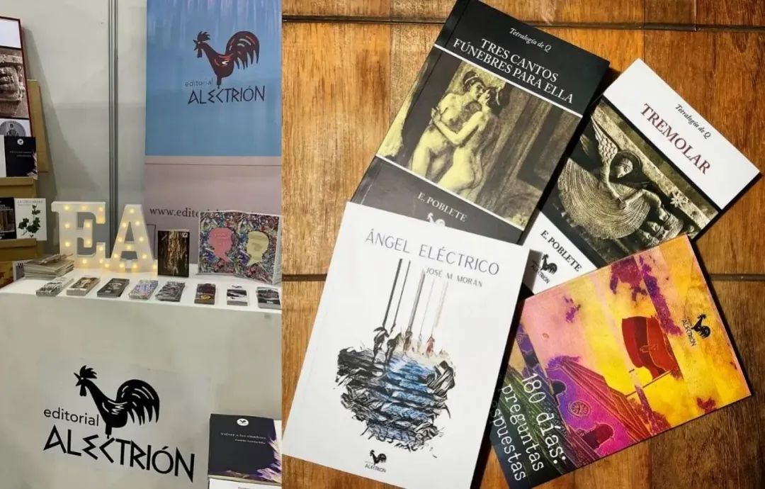 逛过一圈之后,终于找到了一家仍有人营业的厄瓜多尔本土出版商Alectrión,该社的标志是一只正在啼叫的公鸡。接待我的大叔叫Esteban Poblete,是这家独立出版社的合伙人,同时也是图书编辑和作家。终于遇到一位深谙出版业各环节的专业人士,于是我抓紧机会,把其他摊主没解释清楚的问题都抛给了他。