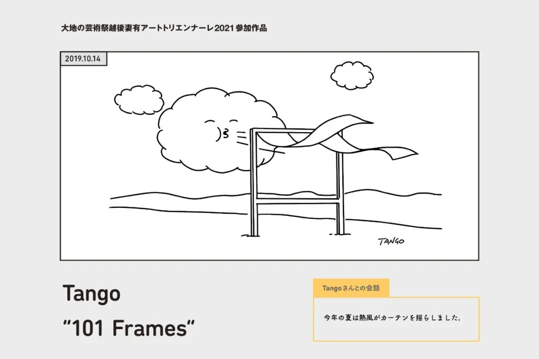 而在线下,Tango先后在巴黎、纽约等城市举办过展览。2020年,他受邀参加日本越后妻有大地艺术祭。按原计划,他将会在新潟县的山村住两三个月,和一群艺术家一起住在废旧的住宅改造成的“旅店”,观察当地的风土人情并完成一百多幅漫画。然而这次旅行最终因防疫的出入境限制而泡汤,他只能依照主办方寄来的资料创作。好在他最终完成了作品,此次大地艺术祭也在延期一年后于2022年4月29日举办。