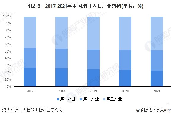 从2017-2021年中国就业人口产业结构变化情况看,第一产业就业人口占比逐渐下降,从2017年的26.70%下降至2021年的22.90%,而第三产业就业人口占比逐渐提升,2021年达到48%。