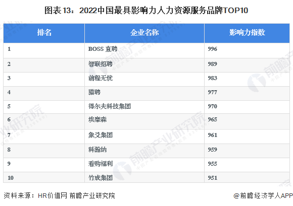 2022年5月20日,HR价值网发布“2022中国最具影响力人力资源服务品牌50强”榜单,位列榜单前三位的品牌分别是BOSS直聘、智联招聘、前程无忧。