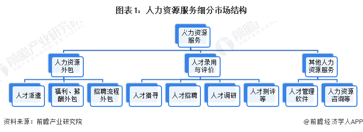 人力资源服务的具体业务可以分为三大块,即人力资源服务外包市场、人才录用与评价市场和其他人力资源服务细分市场。具体细分市场结构如下: