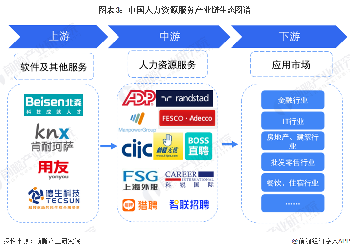 人力资源服务上游系统服务商主要包括北森、肯耐珂萨、用友等,社保相关服务供应商德生科技等;中游有人力资源服务企业主要包括ADP、任仕达、万宝盛华、德科等外企,也包括中智、前锦网络、科锐国际、猎聘等中国企业。