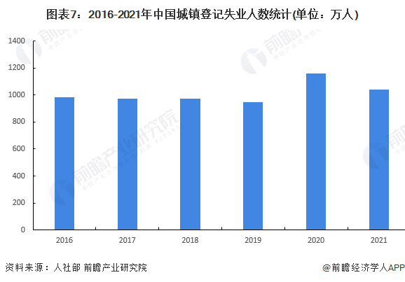 2016-2019年中国城镇登记失业人数维持在945-982万人之间。2020年疫情爆发以来,中国城镇登记失业人数较以前年度显著增加,2020年中国城镇登记失业人数达到1160万人,2021年为1040万人,在国家各项保就业措施的帮助下较2020年减少120万人。