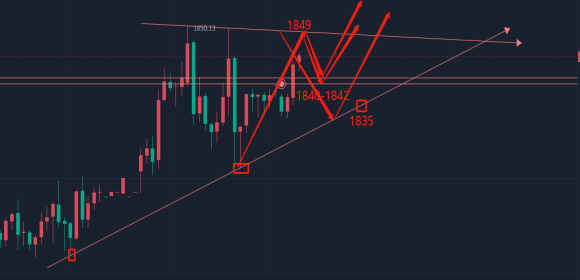昨日回顾:我们看到昨天黄金也是走了一个“M”形态趋势,早间开盘短线回踩下方1823后形成反弹,价格也是最高反弹到了1850的位置,随后欧盘跳水下方1830的位置,美盘回补欧盘跳水的全部利润,午夜又跳水下方1827的位置然后又回补,但整体还是在1840下方运行,昨天那样的行情真可谓是一波三折,今天早间开盘黄金在短线回踩下方1835后,目前价格又强势拉升到上方1845附近的位置,昨天黄金出现这样诡异的行情,主要原因还是美元指数上蹿下跳所以也导致了黄金价格异常波动,面对昨天黄金那样的走势,今天该如何操作,简单从日线和四小时级别进行一个分析;