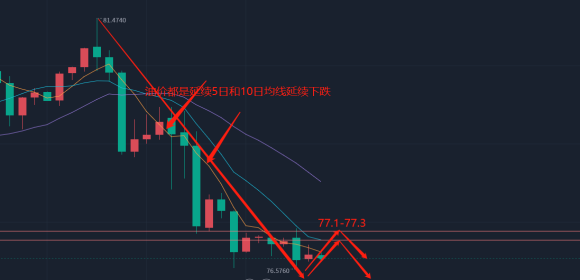 昨日回顾:我们看到原油昨天可谓是一泻千里,早间价格在短线回踩到下方79.3后呈现反弹,价格最高也是反弹到了81.4附近的位置开始跳水,价格最低也是跌到了下方76.6附近的位置,整体跌幅有4.8美金波动,幅度也是非常大,油价昨天出现这么大的跌幅,主要原因还是经济前景黯淡,美指走强,市场对美联储加息路径担忧,所以从而拖累油价跳水走低,面对昨天油价那么弱势跳水,今天该如何操作,简单进行一个分析;