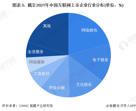 截至2021年12月,在互联网上市企业中,网络游戏类企业数量最多,占总体的20.6%;其次是电子商务类企业,占总体比重为14.8%;文化娱乐类企业紧随其后,占总体比重为14.2%。