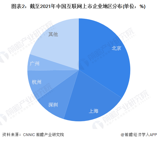 截至2021年12月,我国境内外互联网上市企业中工商注册地位于北京的互联网上市企业数量最多,占互联网上市企业总体的34.2%;其次为上海,占总体的20.6%;深圳、杭州、广州紧随其后,互联网上市企业分别占总体的10.3%、9.7%和5.2%。