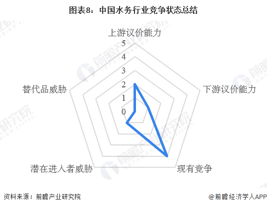 从五力竞争模型角度分析,水务行业大部分工程建设企业都拥有工程项目设计能力,供应商综合议价能力一般;水务行业的下游主要是水务终端市场,包括居民用户和企业用户,单个购买量较小,消费者议价能力较弱;行业处于快速发展阶段,竞争者数量众多,现有企业的竞争较为激烈;水务行业进入壁垒较高,加上行业特有的地域性特征,潜在进入者威胁较小;水务行业属于公用事业,基本没有替代品威胁。