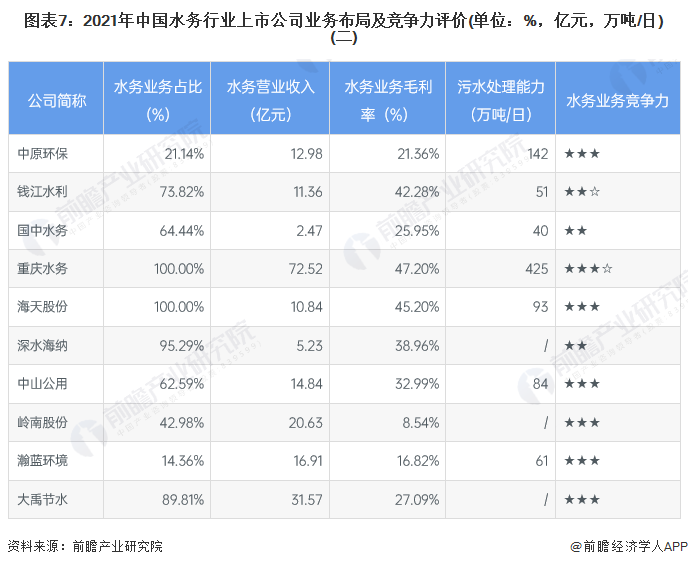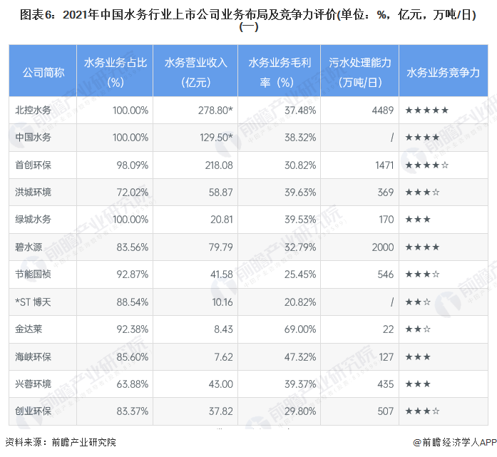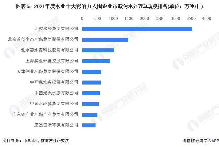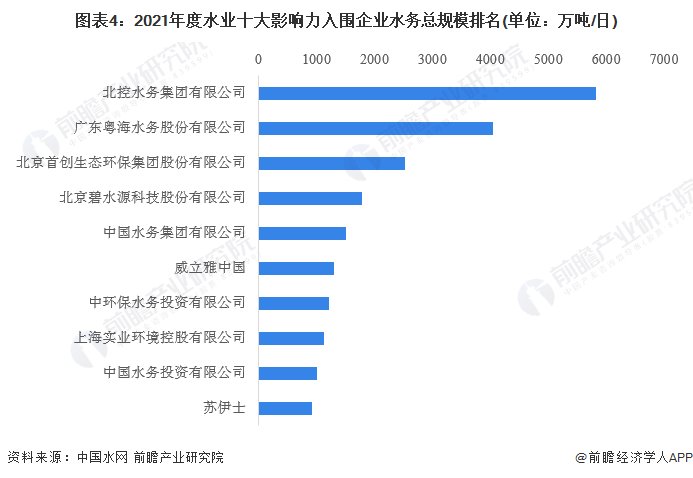 通过对企业的业绩及其在资本市场、稳健运营、企业社责任等方面的综合评价,中国水网评选出2021年度水业十大影响力企业为:北控水务集团有限公司、北京首创生态环保集团股份有限公司、中环保水务投资有限公司、广东粤海水务股份有限公司、苏伊士、中国光大水务有限公司、北京碧水源科技股份有限公司、天津创业环保集团股份有限公司、中节能国祯环保科技股份有限公司、中持水务股份有限公司。