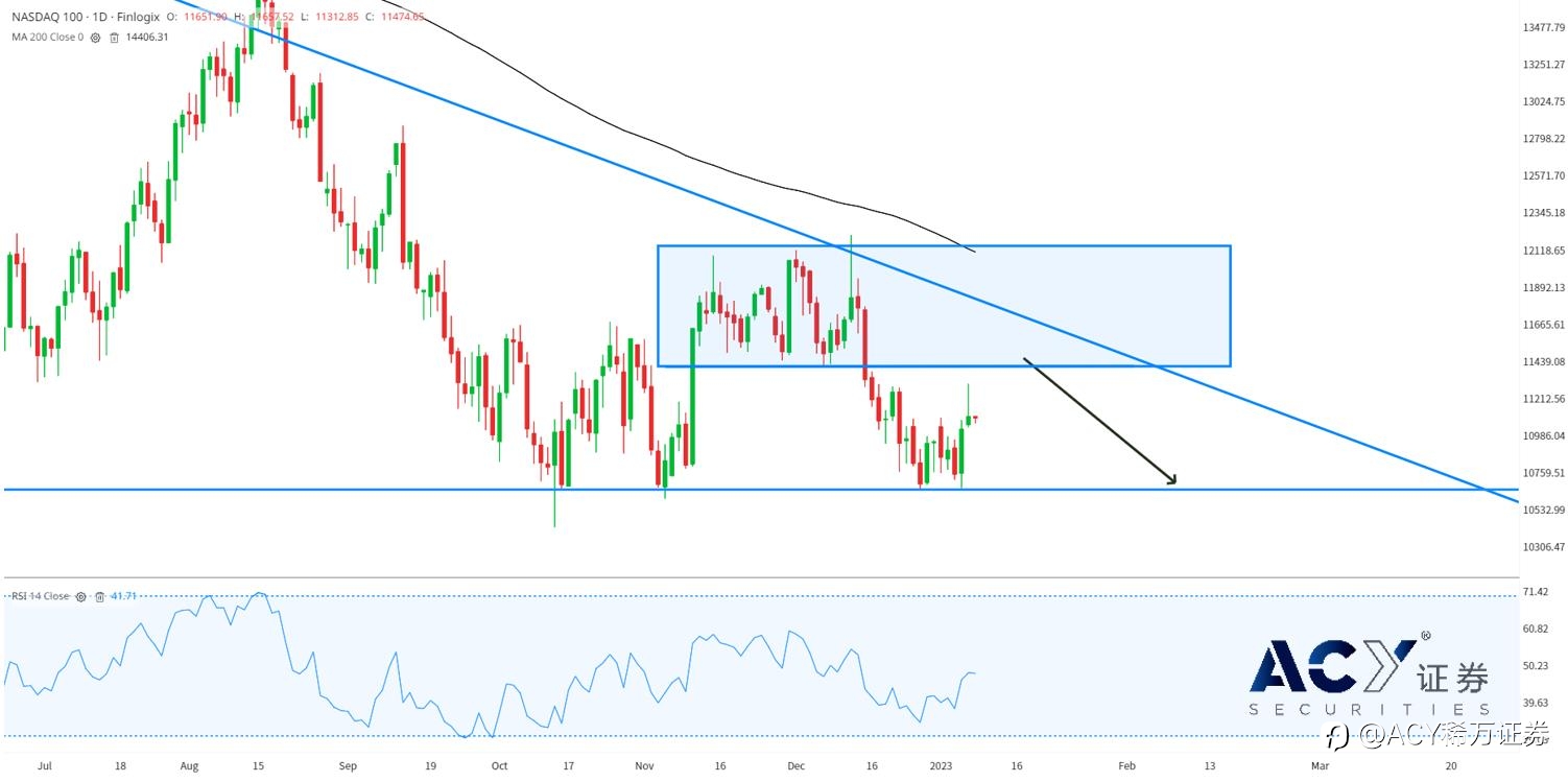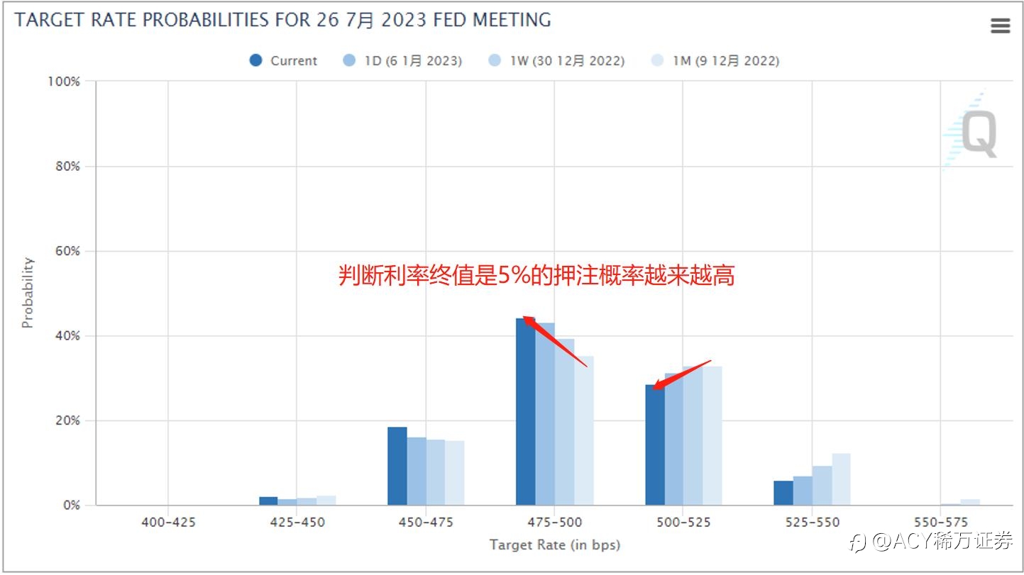 关于加息政策,不要看科技股跌得凶就觉得市场是悲观的,其实从掉期市场定价来看,市场远比美联储更为乐观的。不仅押注2月份加息25基点的概率昨日飙升至80%,同时越来越多交易员认为美联储的利率终值不会超过5%。然而从市场与美联储博弈的内在机制来看,市场越是觉得利率终值不会超过5%,美联储就越需要加息超过5%。背后的逻辑是,市场越乐观,对资产的定价便会越高,反而会迫使美联储进一步执行紧缩。