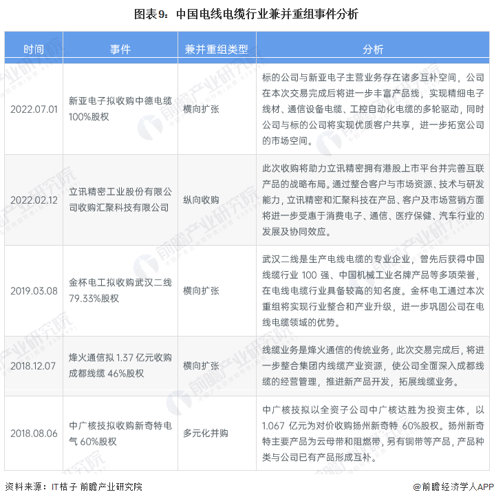 从我国电线电缆行业的主要兼并重组事件来看,新亚电子收购中德电缆100%股权,将进一步丰富产品线;金杯电工收购武汉二线79.33%股权,有利于实现行业整合和产业升级。目前电线电缆行业兼并重组的类型主要为横向扩张。