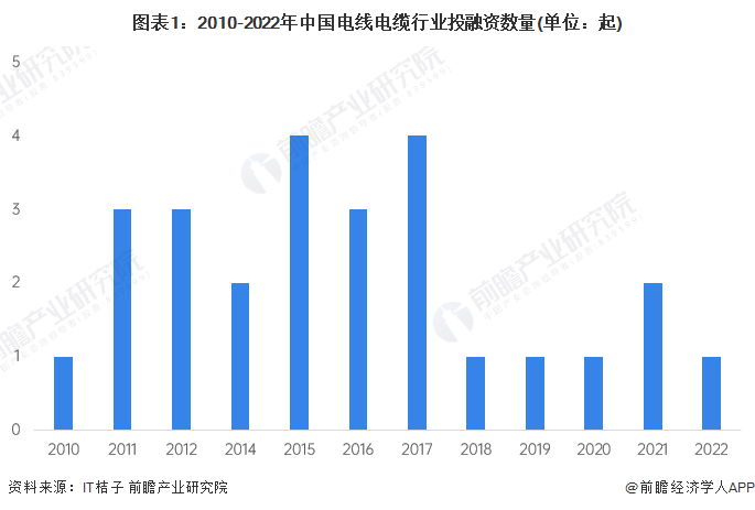 根据IT桔子数据库,2015年和2017年我国电线电缆投融资数量最多,达4起;2018年以来,我国电线电缆行业投融资数量有所下降,只有1-2起投融资事件发生。总体而言,我国电线电缆行业投融资热度不高。