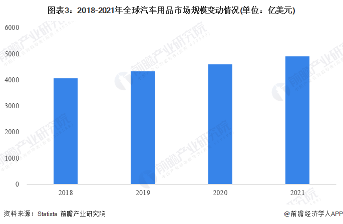 汽车用品依托于汽车行业快速发展,是整个汽车后市场中的重要环节,在全球经济水平不断增长之下,汽车保有量也随之持续提高,这为汽车用品市场增长提供了充足的保障。根据Statista公布的数据,2018-2021年,全球汽车用品市场稳定增长,2021年市场规模达4896.9亿美元,同比增长6.5%。